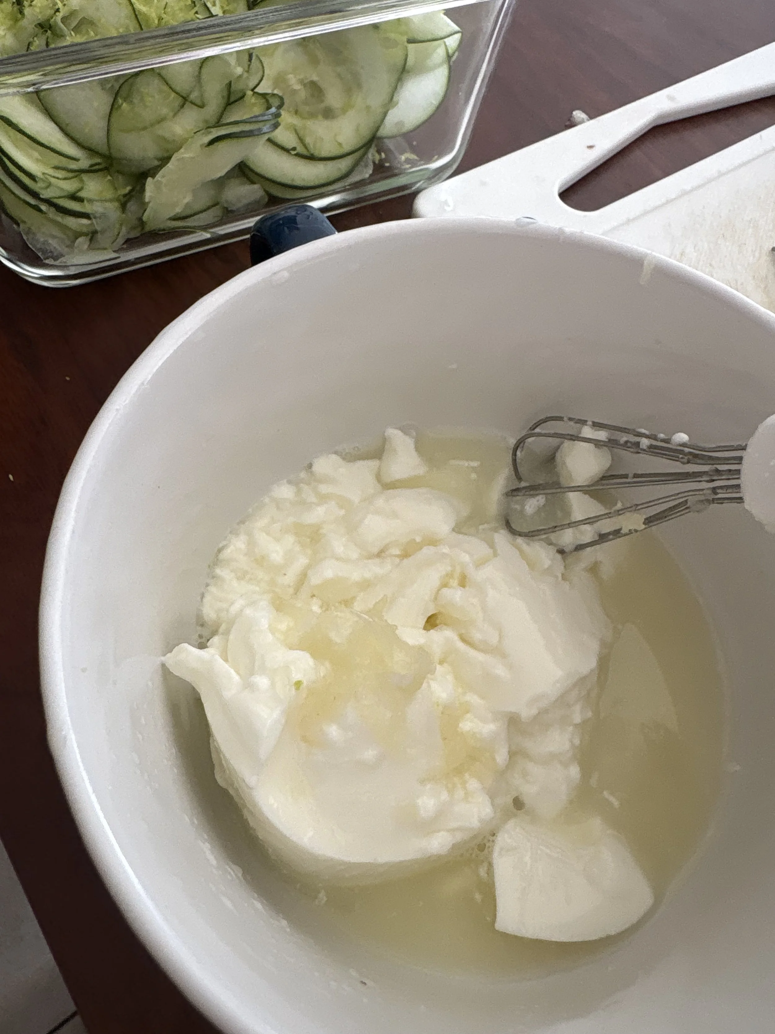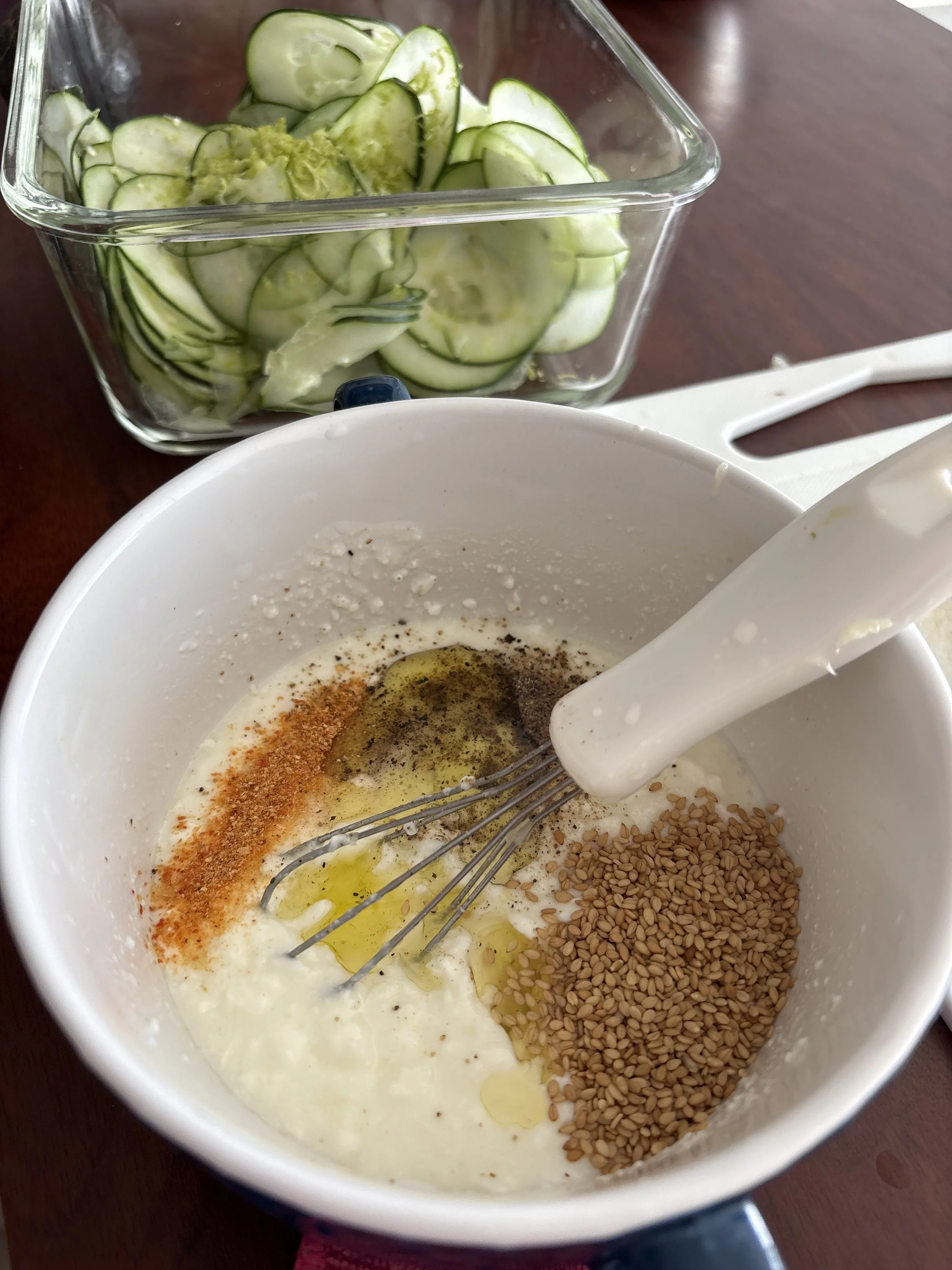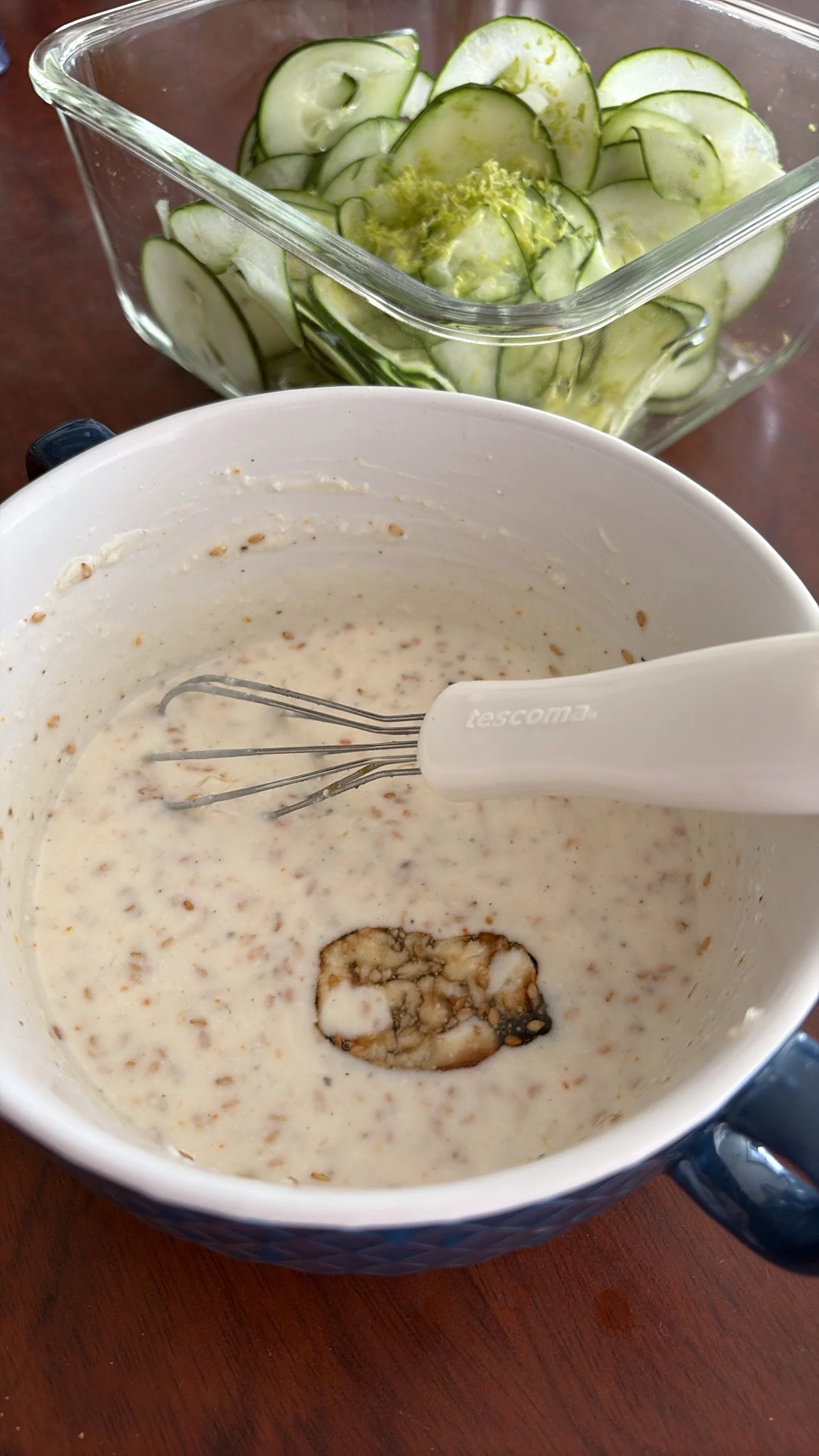 5. En la fuente del pepino agregar la salsa y remover para que la salsa cubra todas las laminas de pepino.